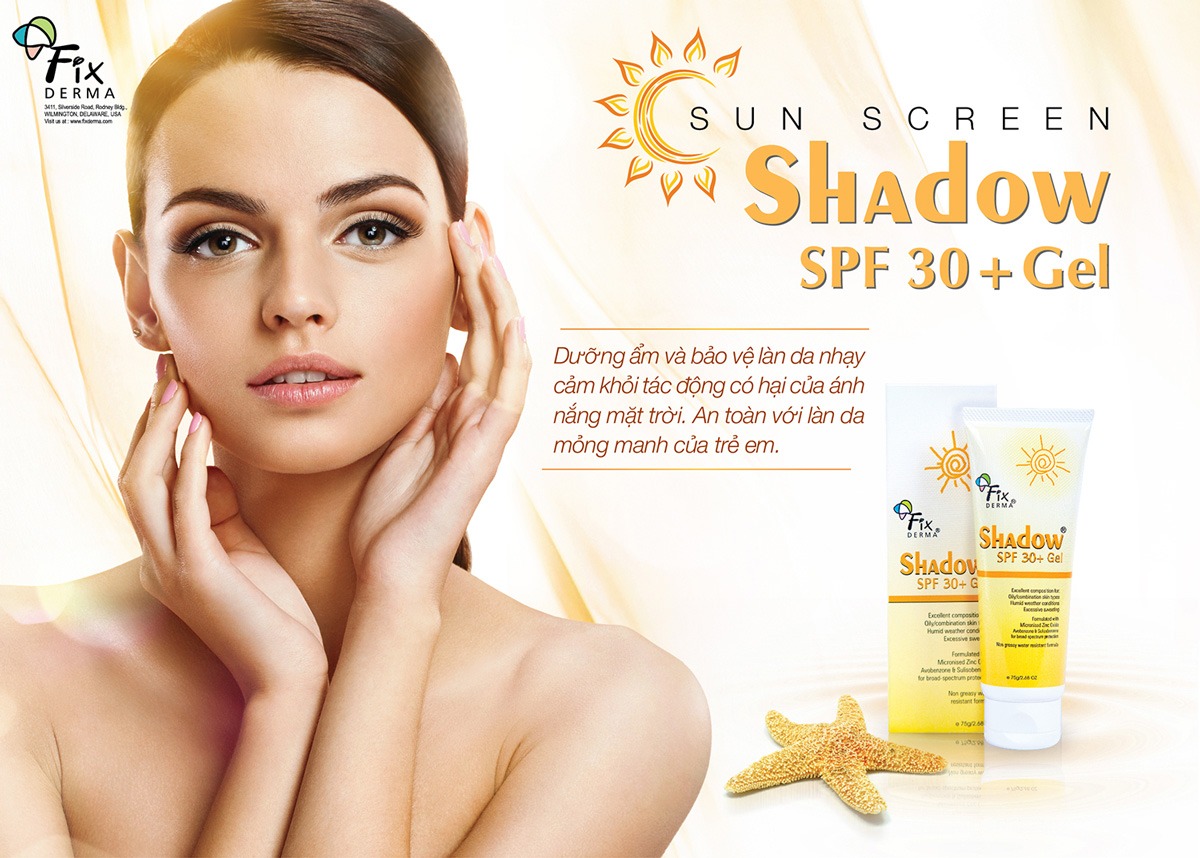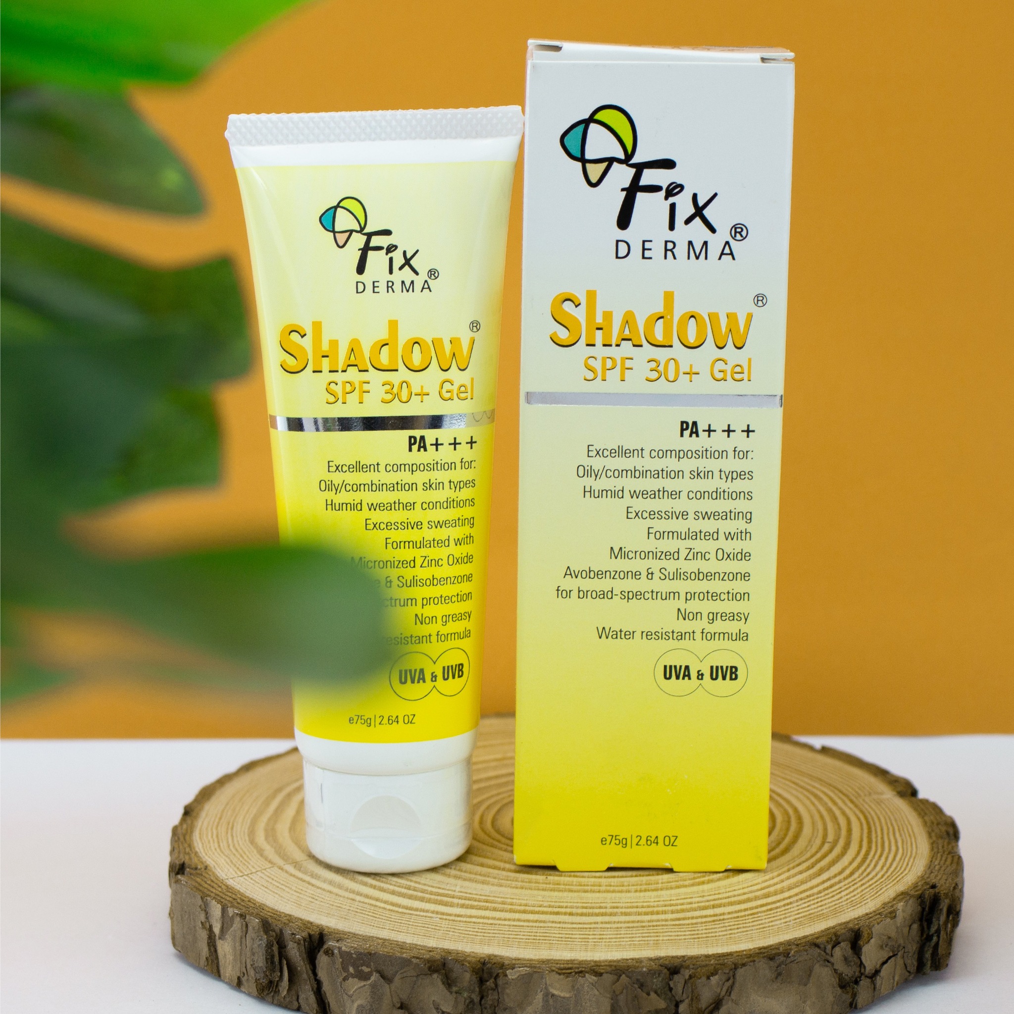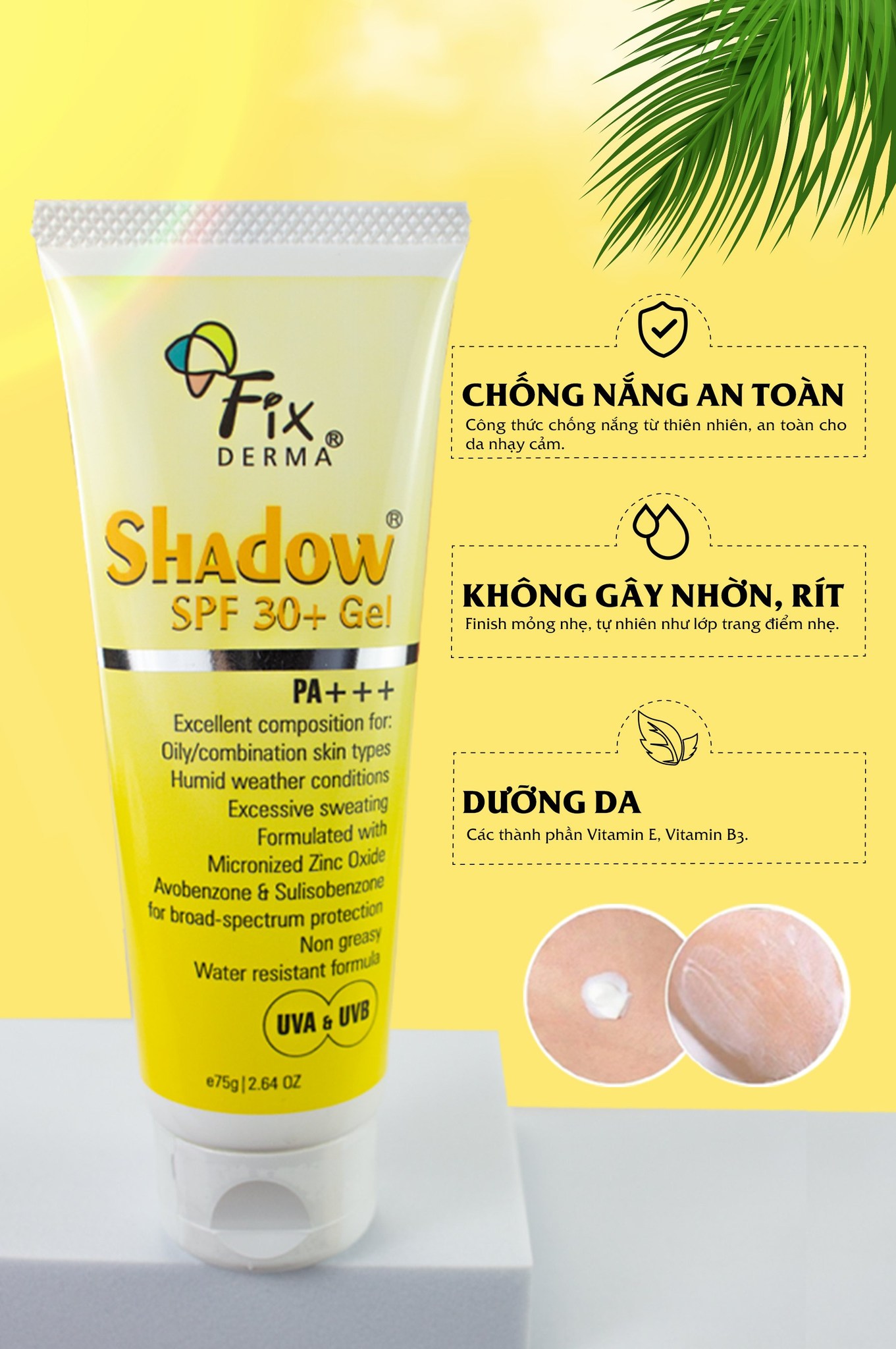 - Gel Chống Nắng Dưỡng Ẩm Da FIXDERMA Shadow SPF30+ Gel là dòng gel chống nắng có công thức kết hợp giữa màng lọc vật lý và hóa học nâng cao khả năng bảo vệ da trước tác hại của ánh nắng mặt trời với chỉ số chống nắng cao SPF 30+, sản phẩm còn cung cấp độ ẩm cần thiết cho da, giúp giảm tiết dầu và tình trạng bóng nhờn trên da, hạn chế bít tắc lỗ chân lông gây mụn.