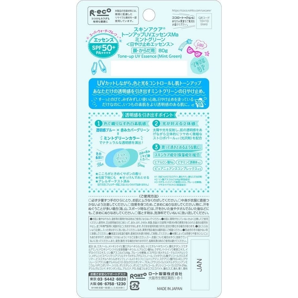 - "Skin Aqua Tone Up UV Essence Mint Green" cắt tia UV đồng thời kiểm soát màu sắc và ánh sáng để làm đều màu da của bạn. Kem chống nắng toàn thân và mặt màu xanh bạc hà làm nổi bật làn da trong mờ độc đáo của bạn.